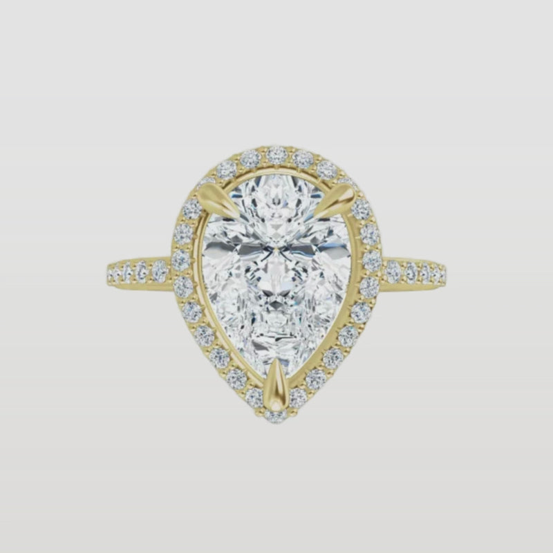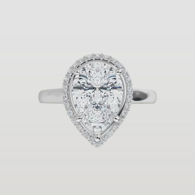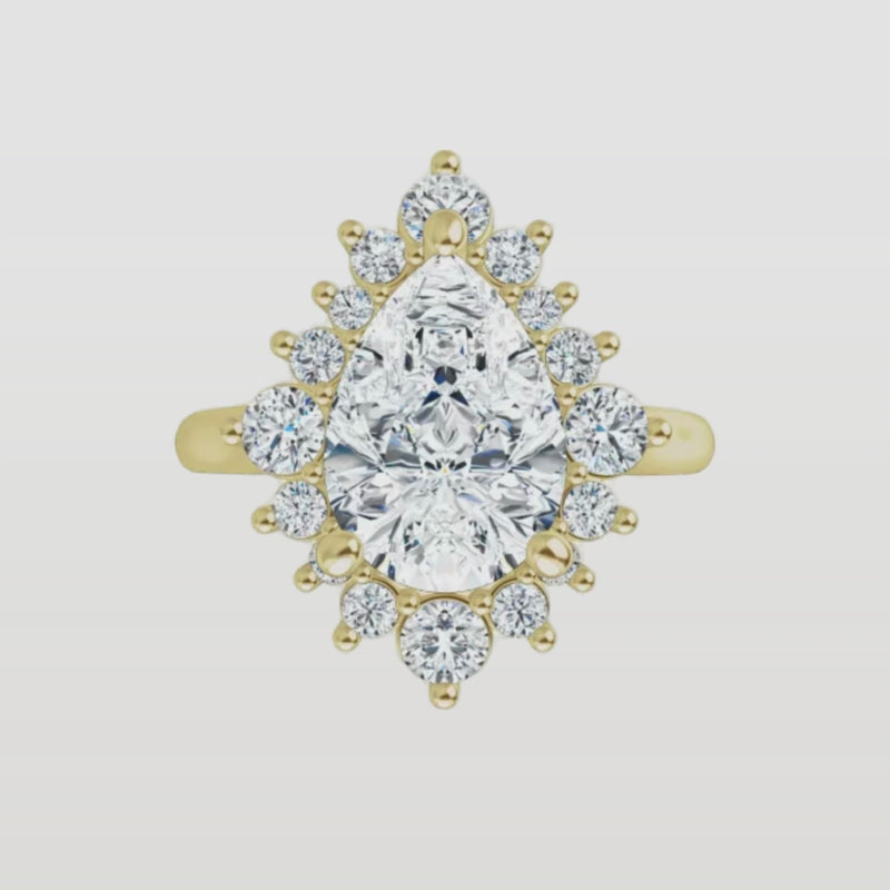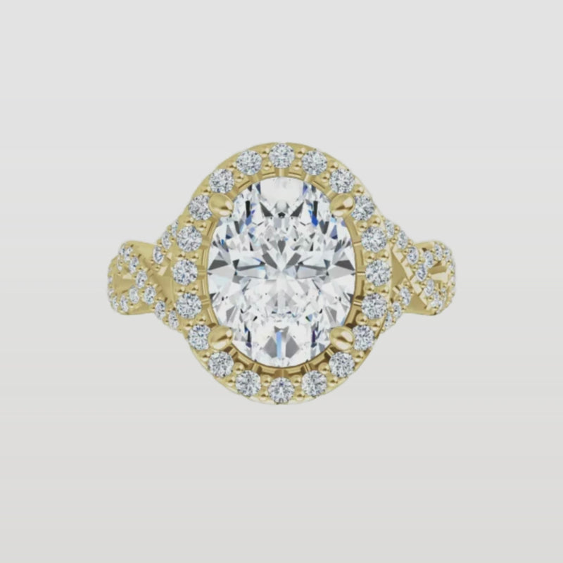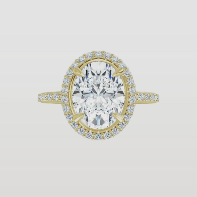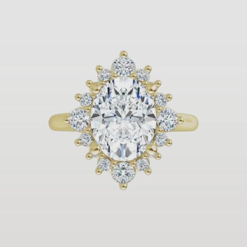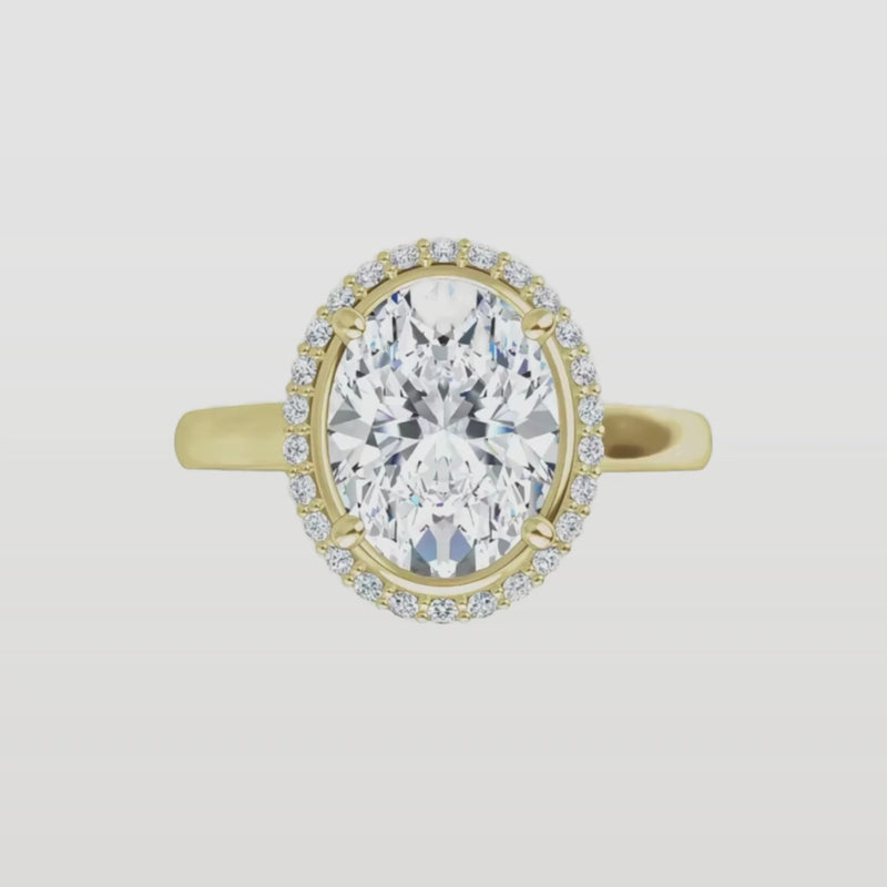 A circle of sparkling diamonds that enhance the center stone’s brilliance.