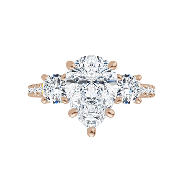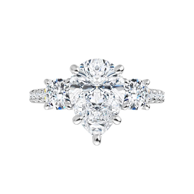 This engagement ring features a center diamond flanked by two pavé-accented side stones, creating a balanced look that honors past, present, and future. With pavé detailing adding extra sparkle, the stones work together to catch light beautifully and shine seamlessly.
