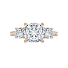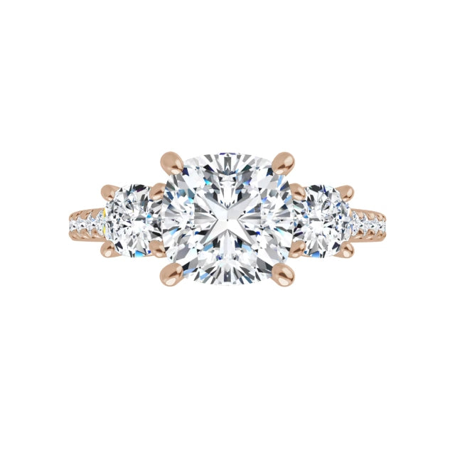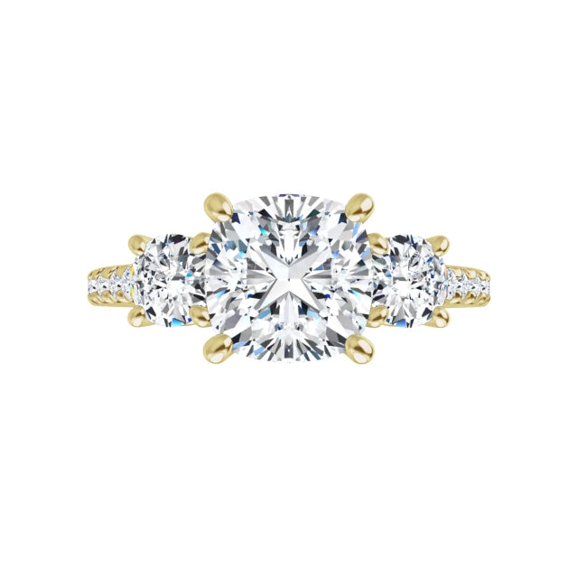 This engagement ring features a center diamond flanked by two pavé-accented side stones, creating a balanced look that honors past, present, and future. With pavé detailing adding extra sparkle, the stones work together to catch light beautifully and shine seamlessly.