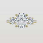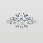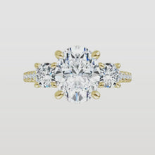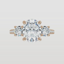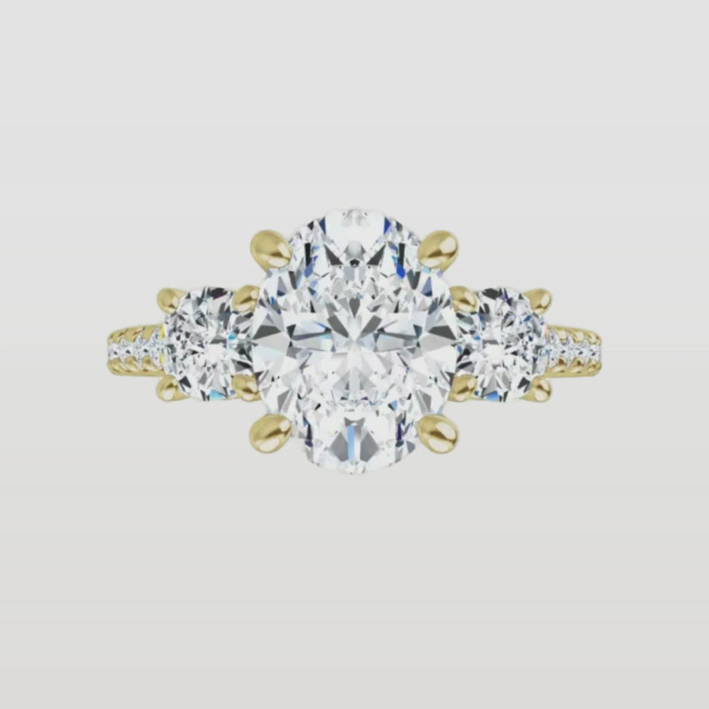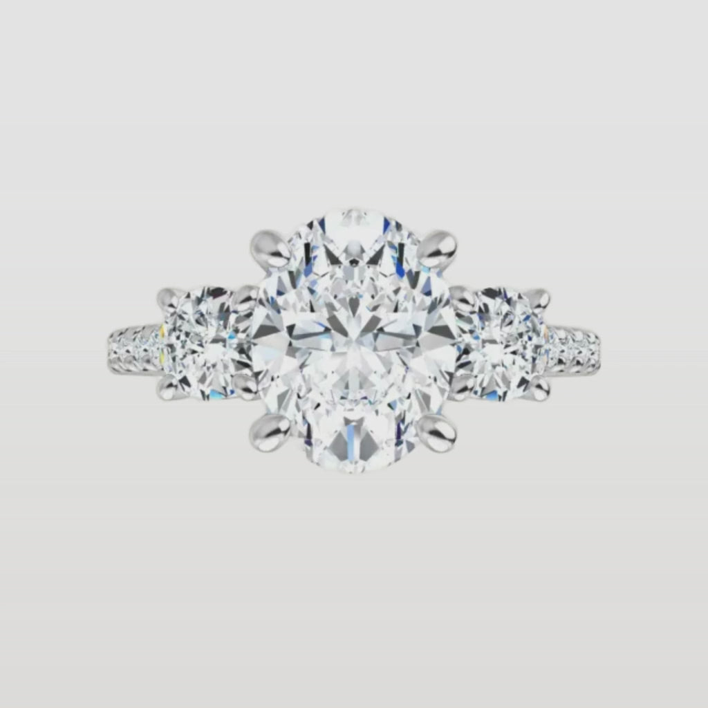 This engagement ring features a center diamond flanked by two pavé-accented side stones, creating a balanced look that honors past, present, and future. With pavé detailing adding extra sparkle, the stones work together to catch light beautifully and shine seamlessly.