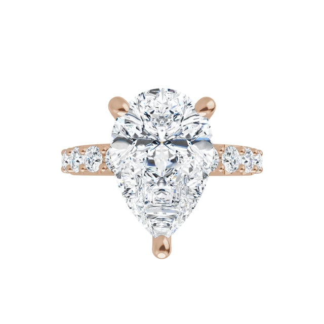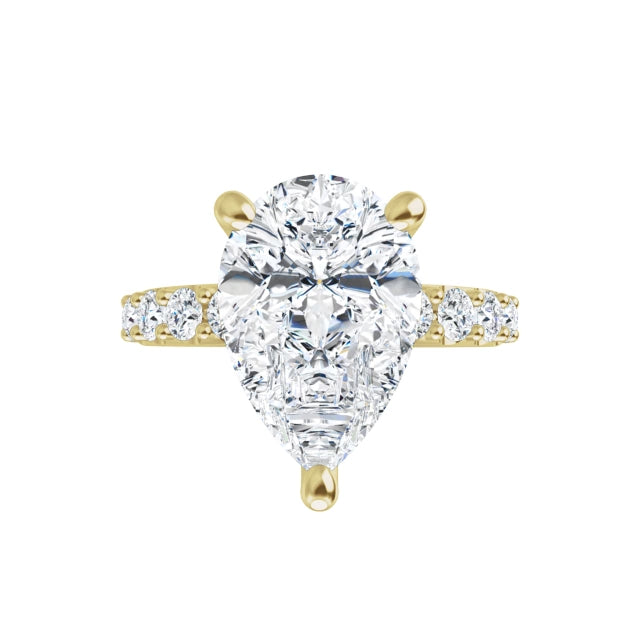 This design pairs quiet sophistication with a secret surprise—a slim row of pavé accents nestled below the center diamond, adding a soft glow that only you truly notice. From above, the look is sleek and clean; from every angle, it’s layered with character.