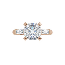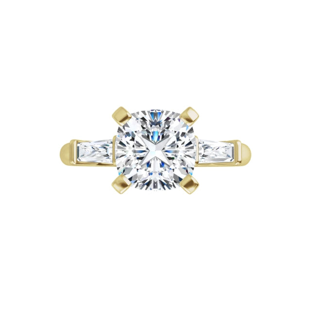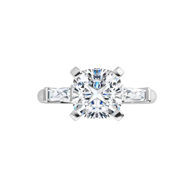 Three stones, each with its own purpose, come together to tell a meaningful story. The center diamond stands poised between tapered baguette side stones, drawing the eye—and the heart—right where it belongs. It’s a design that marries architecture with emotion.