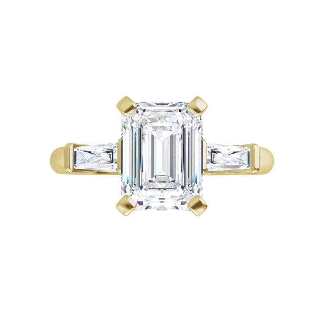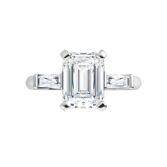 Three stones, each with its own purpose, come together to tell a meaningful story. The center diamond stands poised between tapered baguette side stones, drawing the eye—and the heart—right where it belongs. It’s a design that marries architecture with emotion.