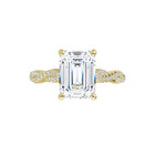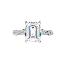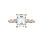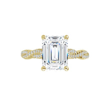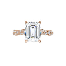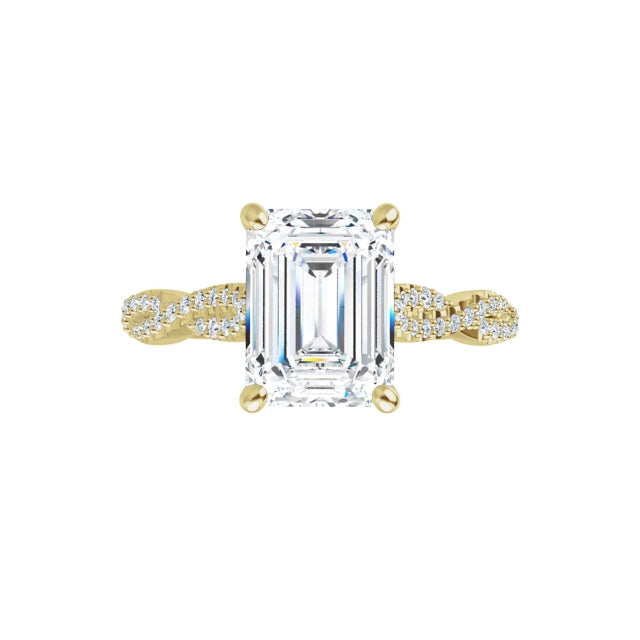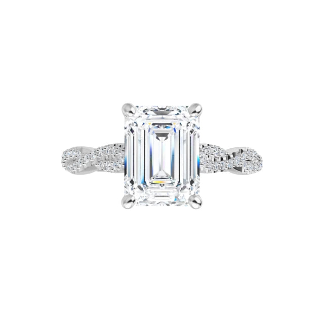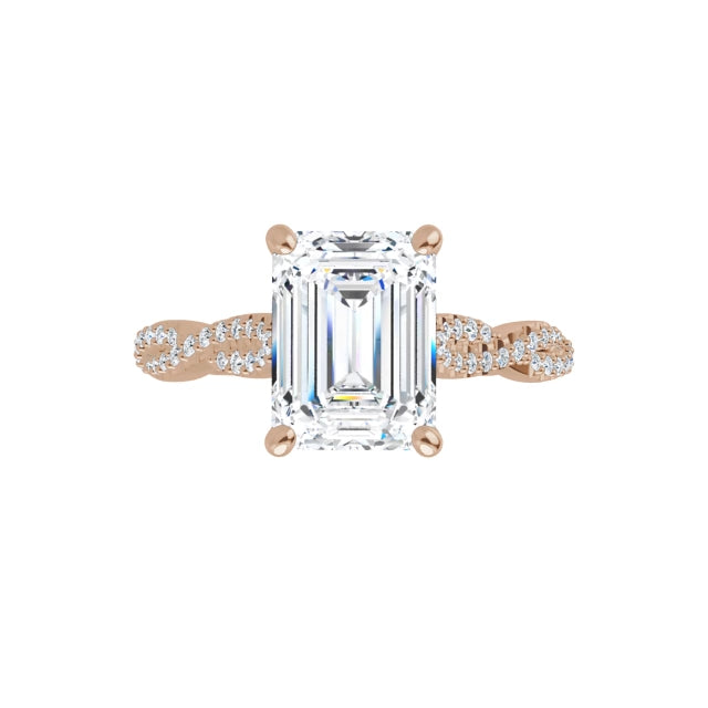 This ring features a gently twisted band accented with pavé diamonds, creating subtle movement that guides the eye toward the center stone. It’s a contemporary take on classic elegance, letting the diamond’s brilliance stand out with effortless charm.