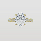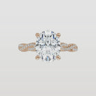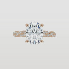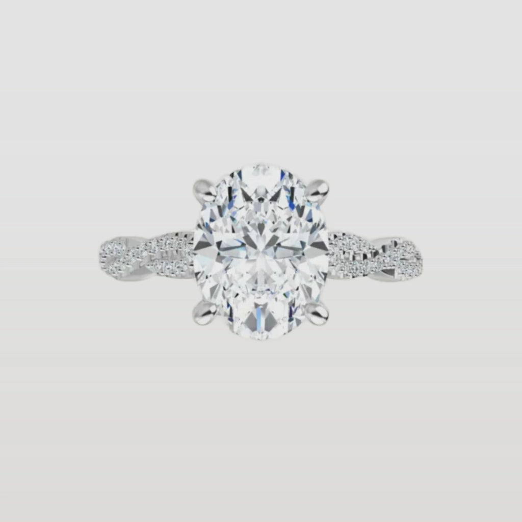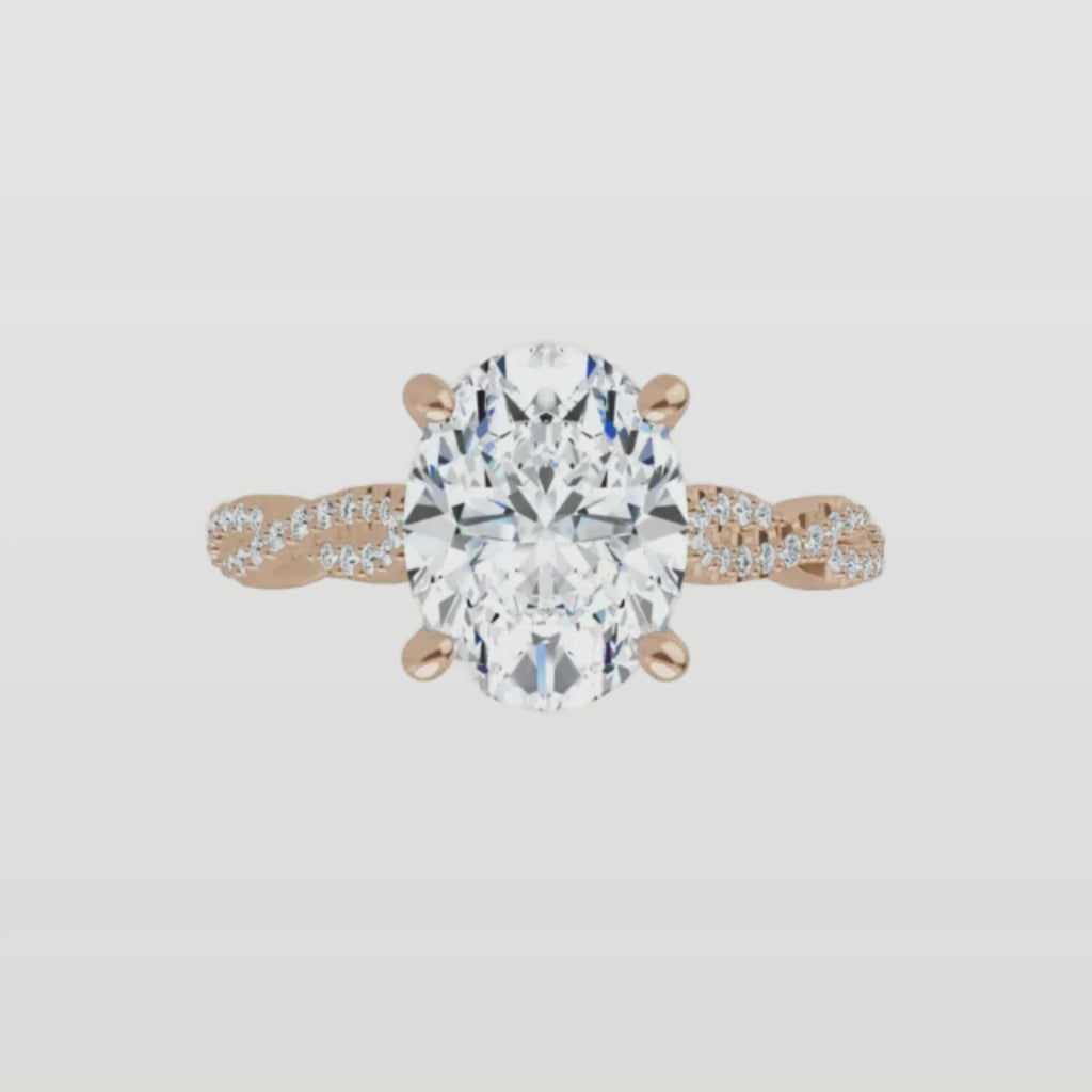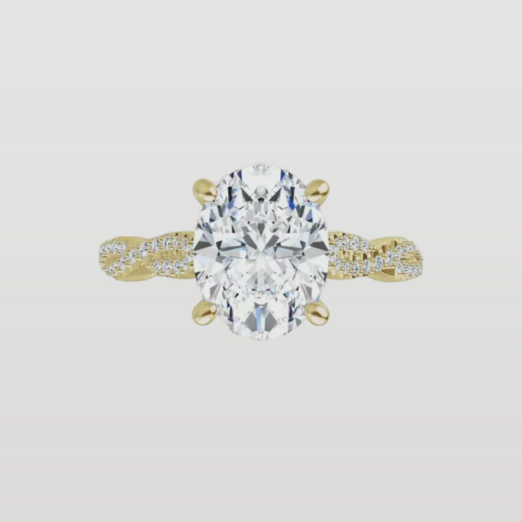 This ring features a gently twisted band accented with pavé diamonds, creating subtle movement that guides the eye toward the center stone. It’s a contemporary take on classic elegance, letting the diamond’s brilliance stand out with effortless charm.